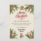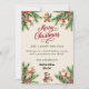 Fundo bege. Galhos de pinheiros e bagas vermelhas, um homem de pão-de-gengibre e uma coruja fofa com lenço e entrega o correio. Feliz Natal é escrito com um roteiro elegante. Texto vermelho, verde e preto. Personalize e adicione seu texto e seus nomes.
