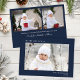 Cartão azul elegante com um design moderno mínimo que mostra sua foto, e "Feliz Natal", seu nome e o ano em uma simples tipografia branca. Adicione duas fotos adicionais no verso, uma saudação personalizada e seus primeiros nomes.