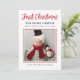 Este cartão com fotos de férias moderno dobra como cartões de natal e anúncio de nascimento para o seu novo bebê. Apresenta o "Primeiro Natal" em um roteiro vermelho com o nome do cheio e os detalhes de chegada do bebê. Personalize com uma foto recém-nascida que é moldada por um padrão de faixas diagonais. Um padrão de coordenação de faixas horizontais largas vermelhas se coloca na parte traseira da placa.
