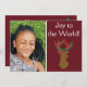 Um cartão de Natal adorável para as férias, este design apresenta um fundo burguês na frente e no verso. A frente tem um modelo para a sua foto à esquerda com "Joy to the World" escrito no lado direito em branco. Há um entalhe decorativo por baixo. O verso tem uma mensagem de feriado quente. Compre o seu hoje!