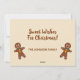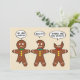 Engraçado pães-de-gengibre em paródia, paródia, aos coelhos coelhos que dizem "Meu bumbum dói". Estes 3 biscoitos engraçados de gengibre com bolhas de fala. O primeiro homem de gengibre tem uma mordida na perna e diz: "Minha Perna Magoa!", o outro tem uma mordida na orelha e diz: "O quê?", os olhos do terceiro já foram comidos e ele diz: "Onde vocês estão as caras?". Especialmente divertido para a Festa de Natal. Um desenho animado do Gingerpão bonito. As costas estão prontas para a mensagem personalizada "Queridos Felizes para o Natal". Pronto para ser personalizado com seu sobrenome familiar, ou qualquer sobrenome.