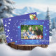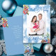 Capture a essência da estação com nosso cartão de Natal personalizável! "Feliz Natal" agarra a frente ao lado de uma festiva mostra de groselhas vermelhas, cones de pinho e agulhas em um fundo azul e branco de flocos de neve. Adicione a sua querida foto de família no centro. No verso, encontre um verso e espaço sinceros para seu toque pessoal. Compartilhe a alegria do Natal, exclusivamente a sua!