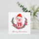 Uma aquarela bonita com um porco feliz vestindo um chapéu de natal e um arco vermelho. Uma bela coroa floral de inverno de pínus, poinsettias e Holly adiciona um toque de feriado a esta adorável criação de xmas. Neve como um padrão de bolinhas no fundo. Modelo personalizável com textos e fotos para personalizar.
