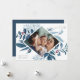 O cartão com fotos Elegante Chanucá apresenta uma foto favorita cercada por uma borda geométrica de uma folhagem botânica azul e minúsculas amoras vermelhas. "Desejando que você ame e acenda" aparece no canto superior direito em letras de cinza, com seu nome familiar no canto inferior esquerdo.