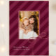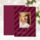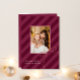 O Cartões de foto de Natal na moda apresenta faixas de fita clássicas em um impressão novo e ousado com uma moderna roxa magenta de férias para um simples cartão de saudação de Natal elegante. Um arco bonito fica no canto da foto central. Personalize este cartão elegante com a sua fotografia da família favorita e o seu nome personalizado com uma saudação sazonal editável.