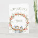Cartão de Natal personalizado com a coroa de fruta de inverno e bonitinho bonitinho. O modelo está configurado para que você adicione um nome à frente da placa e você também pode editar a mensagem dentro. Na parte da frente, lê-se simplesmente "Feliz Natal [nome]" e a design é decorada com uma coroa rústica com bagas de inverno e dois pequenos bonitinhos de neve.