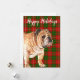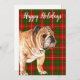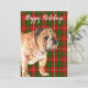 Cartão de Férias com ilustração em aquarela de um bulldog fofo em um fundo xadrez verde e vermelho festivo e saudação de Férias personalizável.