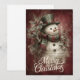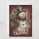 Compartilhe a alegria clássica das festas de fim de ano com este cartão de Natal festivo apresentando um alegre boneco de neve vestido com um chapéu verde com faixa vermelha e um cachecol xadrez vermelho e verde. Rodeado por folhas de azevinho e frutos silvestres contra um fundo texturizado rico em vermelho, o boneco de neve irradia espírito de época. Letreiro cursivo branco elegante escreve “Feliz Natal”, tornando este cartão perfeito para enviar calor, tradição e charme atemporal.