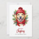 Bonita ilustração do estilo aquarela de um adorável cão Labrador Amarelo vestindo um cachecol vermelho e chapéu num fundo de verde natal.