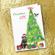 Na frente deste cartão de Natal, um lindo cachorro rottweiler veste um chapéu vermelho e branco de Papai Noel enquanto se senta ao lado de uma árvore de Natal. Pacotes de presentes embalados de forma breve estão espalhados, e um touchete está pousando na árvore de Natal. O texto vermelho e verde diz "JOY Natal". O dentro é um texto estilizado que diz MERRY CHRISTMAS, e um campo de texto para personalizar.