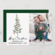 Árvore de pinheiro de serra aquosa com Script de Tinta Elegante Moderno com Fitas Vermelhas Burgundy e Enfeites de natal Feliz Cartão de Férias de Natal - Verde