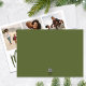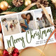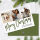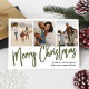 Esta design apresenta um cartão com fotos feliz de natal verde para escrita de caligrafia com um feliz Natal, com um roteiro de caligrafia verde, colagem de fotos, um minimalista simples, tipografia de pincel, um branco mínimo, fofo,3 três fotos, um clássico elegante cartão com fotos de férias
