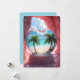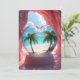 Um vidro em forma de coração encontra uma cena de praia tropical com duas palmeiras, mostrando uma visão serena à beira-mar. Matizes cor-de-rosa quentes cercam o vidro, adicionando uma atmosfera sonhadora à composição.