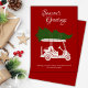 Cartão de cartões de natal plano moderno e elegante, com um carrinho de golfe carregado com uma grande árvore recém-cortada no telhado. Deseje aos seus amigos e familiares "Saudações da Estação" enquanto partilha o seu amor pelo golfe. Precisa de ajuda para personalizar ou personalizar? Entre em contato conosco. Estamos felizes em ajudar. Desejando-lhe as férias mais felizes!