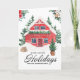 Casa vermelha tradicional vista na neve cercada por árvores. Casa para os feriados e seu nome está escrito abaixo.