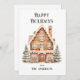 Um lindo cartão de Casa de Gengibre de Férias Felizes em aquarela que pode ser personalizado com o nome da sua família.
