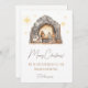 Cartão de Natal da Natividade com uma representação moderna e fofa da cena da natividade. Personalize todo o texto. Simples ilustração moderna do bebê Jesus na mangueira, Mary e Joseph olhando para ele, cercados por curiosos animais do celeiro. Adequado para todos, desde crianças, até colegas de trabalho.