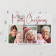 Paisagem de inverno com árvores, uma casa vermelha e queda de neve Feliz Cartão de Natal Feliz. Uma cena de inverno que mostra árvores, uma casa vermelha e neve caindo, perfeita para um cartão de Natal Feliz. Inclui três fotos da família e a mensagem "Feliz Natal", juntamente com uma pequena e encantadora paisagem de inverno. As costas incluem um padrão de árvore, presentes e uma casa vermelha.