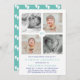 Convite fotográfico minimalista para uma cerimônia de nomeação com espaço para quatro das suas fotos numa simples colagem. As costas apresentam um padrão fofo de pegadas de bebês em branco e em aqua verde.