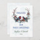 Chic, design romântico com coroa de inverno e dois Bullfinches, NOSSO PRIMEIRO CHRISTMAS ENGOLIU as sequências de falso efeito tipografia em fundo branco com flocos de neve. Use a ferramenta Personalizar para adicionar suas informações e texto. Para mais, visite, por favor, a minha Primeira Coleção de Natal.