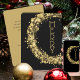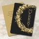 Círculos e estrelas douradas e pontos num fundo preto rodeiam a palavra "FELIZ" ou a sua mensagem na frente e os seus nomes e saudações nas costas. QUALQUER fonte e cor da fonte. **ADICIONE uma foto no verso com sua saudação personalizada. Selecione Matte para o papel mais pesado e alta definição para melhor qualidade de impressão.