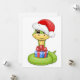 Desenho animado fofo de cobra verde com chapéu de Papai Noel segurando um grande presente de Natal azul.