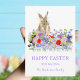 Um cartão de saudação de coelho e felz pascoa de Páscoa com cor d'água, com parte roxa e tipografia. Belos primavera de boho, incluindo flores de cornflores, margaridas e flores de prados de jardim. Pintura moderna à mão em tons azuis, vermelhos, cor-de-rosa, roxos, verdes e lavandas. Fácil de personalizar o moderno script de tipografia de escrita manual para que você possa adicionar seu nome de família e saudações. Arte original da artista Catherine Sweetman