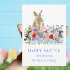 Cartão de saudação de coelho de páscoa e felz pascoa de flor selvagem com azul de pantanal e tipografia. Belos primavera de boho, incluindo flores de cornflores, margaridas e flores de prados de jardim. Pintura moderna à mão em tons azuis, vermelhos, cor-de-rosa, roxos, verdes e lavandas. Fácil de personalizar o moderno script de tipografia de escrita manual para que você possa adicionar seu nome de família e saudações. Arte original da artista Catherine Sweetman