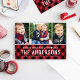 O cartão com fotos mínimo de "Enviando Natal Mais Alegre" apresenta um design de texto branco moderno que pode ser totalmente personalizado com três (3) fotos favoritas, texto preferido, sobrenome, membros da família e ano. Apresenta um padrão de xadrez de búfalos vermelho e preto rústico na frente e atrás do cartão de saudação. Crédito da foto: Fotografia de dois peixes www.twofishphoto.com