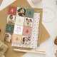 Capturar a magia da estação com o nosso belo cartão de férias. Apresentando uma captivante colagem de 5 fotos em pastéis e ouro, uma encantadora árvore de Natal, e a mensagem "Feliz e Brilho" em elegantes fontes sans-serif. Adicione um toque pessoal com seu nome de família e ano. A design divertida e vibrante se reverte para um encantador padrão de bolas de Natal. Espalhe alegria e faça memórias com esta obra-prima festiva.