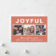 Este moderno cartões de natal de três fotos apresenta um grande tipo de alegria e uma saudação Feliz de Natal com seu nome em um fundo laranja de coral tendencioso. A parte traseira desta placa de tendência é branca sólida.