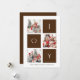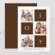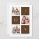 Envie cartões de natal personalizáveis e personalizados para amigos, colegas e familiares em placas de estilo simples, chic, elegantes e modernas de 3 fotocolagens design festivas, naturais minimalistas! Uma colagem de três fotos cercada pela palavra "alegria" na tipografia marrom moderna é apresentada à frente. Abaixo, a caligrafia apresenta sua mensagem de saudação personalizada do nome da sua família na tipografia moderna. Inverso para revelar um belo fundo castanho neutro escuro.