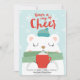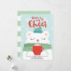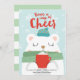 Ilustração fofa de inverno de um urso polar vestindo um cachecol verde e chapéu azul enquanto segura uma xícara vermelha de cacau quente em um fundo de inverno azul claro. Desenho de Shelby Allison. Personalize esses cartões com seu cumprimento e assinatura.