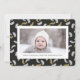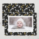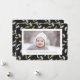 Enviar cartões de natal personalizáveis e personalizados a amigos, colegas e familiares em cartões com fotos simples, minimalistas, elegantes, divertidos, festivos e modernos! Uma bela variedade de ouro e folhas brancas de Mistletoe Pine Tree no fundo preto rodeia sua foto em papel redondo. A saudação personalizada de 'Feliz Natal' e o seu nome familiar aparecem na tipografia moderna. Inverso para revelar um belo cheio Mistletoe Pine Tree de Natal.