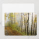 Dreamy autumn in the park. Soft mist, yellow trees, and fallen leaves on the path. Perfect card to convey a subtle autumn mood.