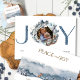 Aprecie os amigos e a família com este elegante cartão de férias com duas fotografias. Design com na moda azul e cinza padrão de espiral prateada como fundo. Na frente, enquadre com sua imagem e três seções de texto para sua própria personalização. No verso, o mesmo padrão de espiral da frente na parte superior e inferior, assim como a frase maravilhosa "JOY" com as letras "J" e "Y" recheadas de padrão de espiral, enquanto a letra "O" mostra sua segunda imagem com azul e prateado fino como cobertura de fotos. Coleção com coordenação de produtos disponíveis.