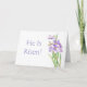 Cumprimento do dia da ressurreição da páscoa do vintage que caracteriza flores roxas bonitas, um crucifixo e o texto que lê, "é aumentado!". Personalize este cartão com seu próprio texto clicando o botão da personalização.