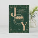 Celebre a magia do Natal com este cartão simples, mas lindamente trabalhado. O design combina tons verdes ricos com detalhes dourados, emoldurando um ornamento festivo aninhado dentro da palavra “JOY”. Uma pacata aldeia de inverno brilha por dentro, simbolizando conforto, família e felicidade. Personalize-o com sua mensagem e traga alegria para sua família e amigos.