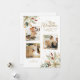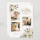 Design floral elegante e único, de 3 fotografias, com buquês de canto, de poinsettia branca, colorido e pinheiro, com brilho dourado. Inclui saudações de Feliz Natal em fluxo em um roteiro decorativo e um campo de texto editável. A parte traseira apresenta um gráfico floral complementar e campos de texto adicionais.