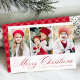 Cartão de Natal simples com três fotos verticais com "Feliz Natal", apresentado num roteiro de caligrafia vermelho festivo. Personalize a frente do cartão de Natal multifoto com seu nome de família e o ano. A placa se reverte para exibir um padrão moderno de xadrez vermelha e branca.