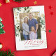 Esta elegante carta de Feliz Natal apresenta uma ilustração de estilos de aquarela de flores e galhos de pinheiro com traços de falso brilho. Uma foto de família está no centro. Esta design tem uma aparência rústica, mas moderna, e é perfeito enviar desejos de férias a parentes e amigos.