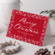 Cartão de Natal elegante com "Feliz Natal" exibido na frente em um roteiro de caligrafia branco e ousado com floco de neve branco e borda de pínus em um fundo vermelho. Personalize a frente do cartão de feriado que não seja fotográfico adicionando seu nome e o ano. O dentro da placa fornece espaço para sua mensagem pessoal digitada ou manuscrita. A parte de trás do cartão de feriado moderno apresenta um lindo padrão de flocos de neve.