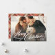 O cartão com fotos de Férias apresenta um design de sobreposição "Feliz Natal" em um belo texto de script branco com texto personalizado que pode ser personalizado com o(s) seu(s) nome(s), o ano e uma foto de estilo paisagem favorita. Um padrão sofisticado de xadrez bege, bronzeado, vermelho e tartã marrom se veste na parte de trás da carta.
