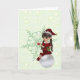 Uma menina fofa, vestida de vermelho com sinos nos dedos dos pés. Ela segura um spray sagrado numa mão e um Enfeites de natal na outra. Ela está sentada numa órbita de inverno sobre um fundo de neve. Você pode adicionar texto a este cartão.