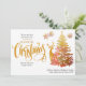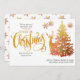Cartão de Natal Elegante, Dourado e Branco, que dobra como seu anúncio de gravidez de férias. A design apresenta uma Árvore de Natal e cervídeos de floresta, flocos de neve e inscrições manuais. O anúncio de gravidez diz que "os melhores presentes não vêm de uma loja, desejando um Natal mágico de nossa família de quatro". Você pode adicionar seu texto personalizado à frente, por exemplo, seu logoff e nomes; nome do bebê e data de vencimento. A carta tem um padrão de floco de neve no verso. Procure mais designs na nossa loja.