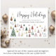Cartão de férias mínimo moderno para sua empresa com ilustrações retrorativas abstrato de árvores e estrelas de Natal verdes, terractas e douradas, "Felizes Feriados" em um roteiro de na moda e sua saudação e nome de empresa em uma simples tipografia.