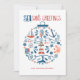 O cartão de Cartões de natal inspirado na praia apresenta um padrão de peixes tropicais, farol, cauda de baleia, concha, caranguejo, dólar de areia, veleiro, cavalo de mar e roda do capitão em forma de um Enfeites de natal com "Saudações do SEAson" em uma fonte náutica legal. Trabalho de arte original do KL Stock.