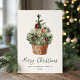 Compartilhe a alegria das festas com este cartão de Natal rústico com uma árvore de Natal em aquarela. O design apresenta uma árvore de folha perene pintada à mão adornada com enfeites vermelhos, verdes e dourados caramelo e luzes suaves brancas, aninhada em uma cesta de vime trançado. "Feliz Natal" é exibido abaixo em letra cursiva verde manuscrita, com o nome da sua família e o ano mostrados abaixo. Contra um fundo creme quente, este design não fotográfico oferece uma aparência aconchegante e inspirada em uma casa de fazenda. O verso inclui espaço para uma mensagem pessoal.