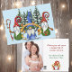 A frente deste cartão de Natal plano tem três gnomos engraçados desejando um Feliz Natal. O gnomo central está vestido de azul e segura uma faixa de ouro com texto vermelho que diz "Desejamos-lhe um Feliz Natal". De ambos os lados estão gnomos vestidos de vermelho e verde. Atrás deles estão os pinheiros cobertos por neve, e tudo é colocado sobre um fundo azul céu. A parte traseira do cartão tem outra imagem de um gnome na parte inferior, campos de texto personalizados para sua própria mensagem e assinatura, e sua própria fotografia. Brilhante, colorido e divertido!