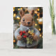 Mande saudações de Season para seus amigos e família com este lindo cartão de esquilo. Eles seguram pinhas festivas e flores crochetadas enquanto a árvore de Natal brilha atrás delas.